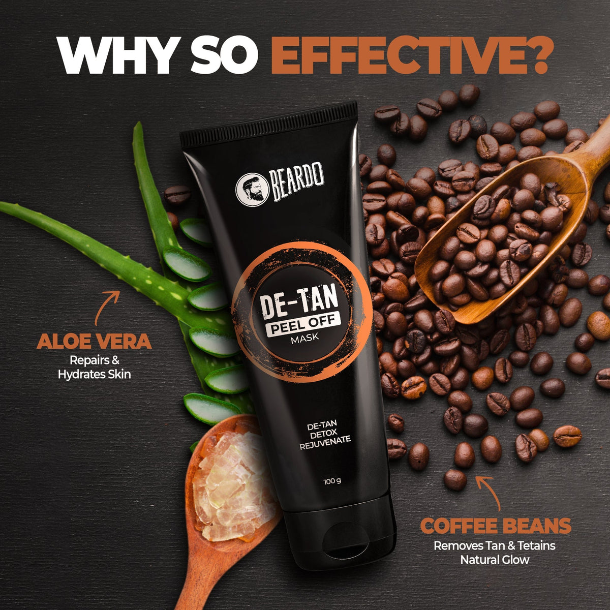 The Beardo De‑Tan Peel‑Off Mask is formulated to deep-clean pores and reduce surface dullness. Fortified with coffee extract and aloe vera, it helps remove dead skin cells, blackheads, and accumulated tan, restoring a refreshed and natural-looking glow to men's skin