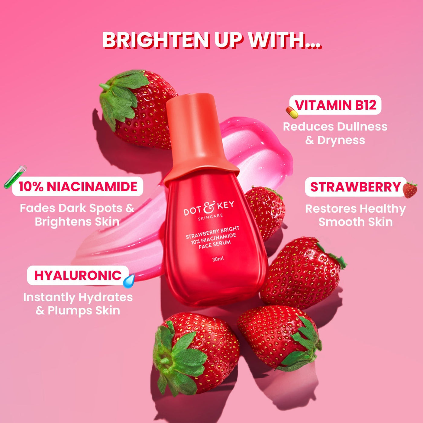 NIACINAMIDE: Reducesdark spots&pigmentationtobrighten skin HYALURONIC ACID: Hydrates skin, leaving itsoft & plumpfor long hours. STRAWBERRY: Anti-oxidant rich, itchecks free radical damagefor healthy skin