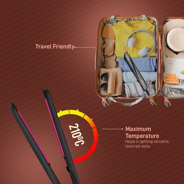 Introducing Go Straight, the perfect fusion of style and functionality in a hair straightener. Its vibrant poppy-coloured ceramic plates not only catch the eye but also deliver exceptional performance. With floating ceramic plates, achieve a sleek, frizz-free look effortlessly. Rapid heating in just 60 seconds coupled with 1-inch wide plates ensures efficient styling for all hair types. Plus, its ergonomic design and convenient lock function make storage a breeze. Get salon-worthy results effortlessly at home with our versatile straightener. HOW TO USE? Plug in, press on. Set desired temperature Brush thoroughly and ensure dryness. Apply heat protectant Start near the scalp for a desired look