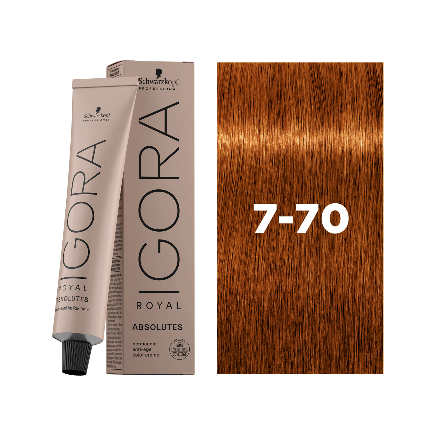 Schwarzkopf Professional Igora ROYAL Absolutes 7-70 Medium Blonde Copper Natural permanent colour creme with up to 100% white hair coverage. The creme can be used for all colour techniques. It provides an intense fashion shade and superior white hair coverage for mature hair and up to 3 levels of lift. Schwarzkopf Professional Igora ROYAL Absolutes with siliamine and collagen contain a long-chain care polymer that adheres to the surface of the cuticle. The smooth top of the polymer creates a sleek, even surface giving hair optimal tone and shine.